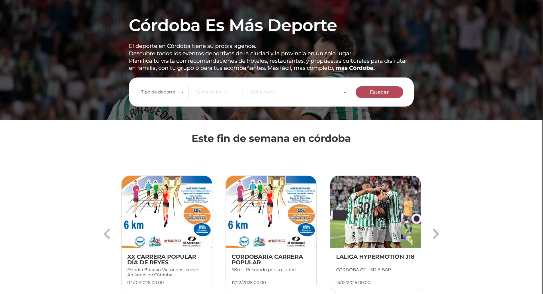 En Córdoba es más deporte hemos desarrollado una plataforma diseñada para planificar una estancia completa en la ciudad, integrando deporte, cultura y bienestar. A través de nuestras herramientas de descubrimiento, los usuarios pueden explorar eventos deportivos, planes de ocio y experiencias culturales, mientras que el Mapa Interactivo permite localizar alojamientos y establecimientos gastronómicos “amigos del deporte”, que combinan confort y nutrición adecuada para quienes practican actividad física. Todo el contenido está orientado a ofrecer una experiencia integral, enriquecedora e inspiradora, consolidando a Córdoba como un referente en deporte, turismo activo y vida saludable